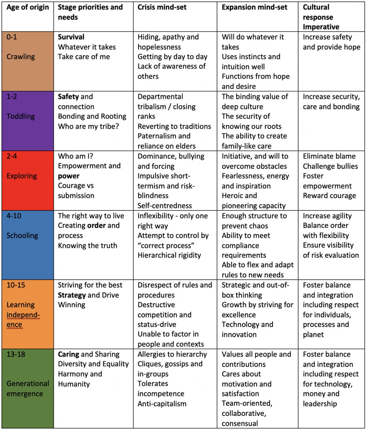 Physiologically, humans develop through established sequences so we know when to expect walking or teething. There are equivalent patterns for our psychology. These priorities are embedded in our being as we develop. They don’t disappear and can be triggered by the conditions we encounter, such as stressors. Here is a very simplified picture of that developmental sequence.